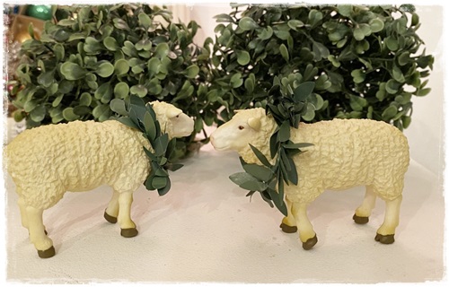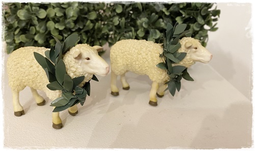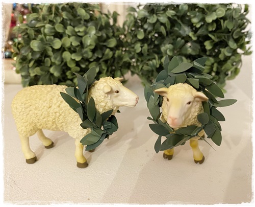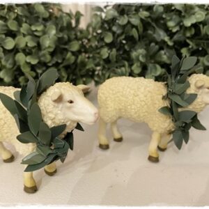 Het schaapje heeft een groen kransje over zijn nekje.