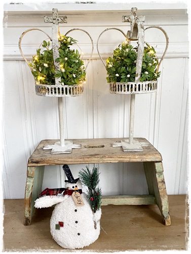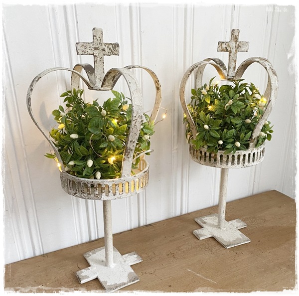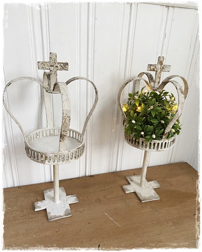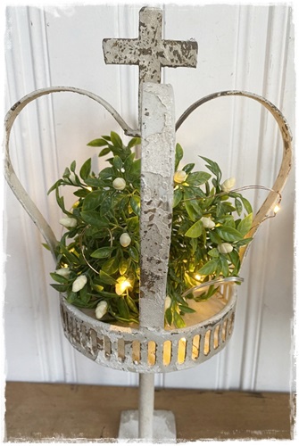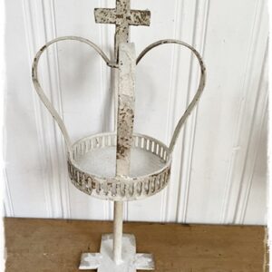 Brocante zeer oude look kroon op voet, mooi bewerkt en kruis bovenop, 40 cm. hoog