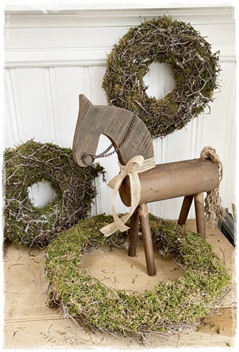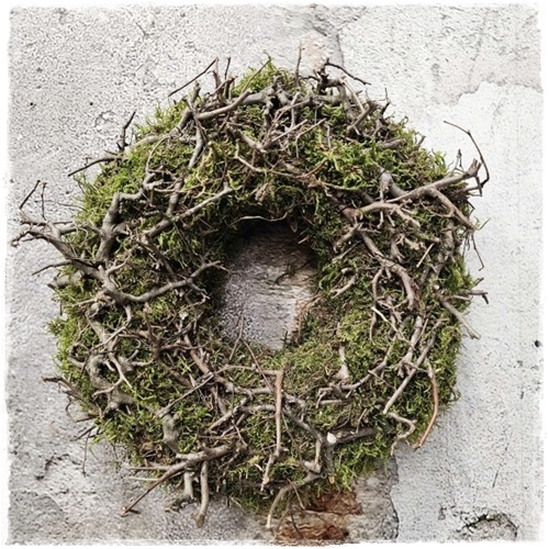 Landelijke prachtige natuurlijke krans met mos en takjes, 30 cm. doorsnee en 10 cm. hoog.