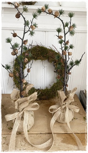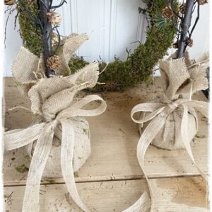 Mooi dennenappel boompje van 70 cm. groot wat in een jute zak staat met strik (niet van echt te onderscheiden)