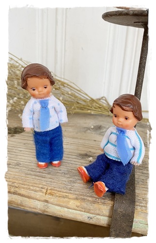 Oud ARI poppenhuis popje van 8 cm. groot. wit met stipje truitje, blauw broekje, blauw dasje