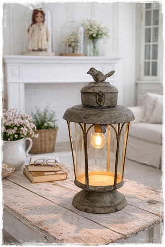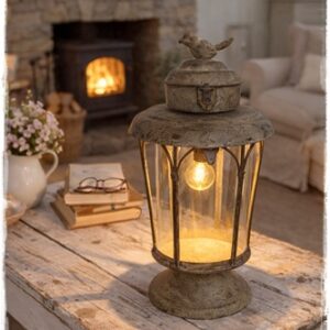 Oude look ledlantaarn op voet met vogel bovenop roest 32 cm hoog